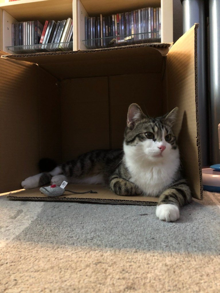 Noch am selben Abend hatte ich die gesamte Wohnung erkundet, meine eigens mitgebrachten Sachen interessierten mich wenig. Einen Tag später durfte ich schon in Fox‘ Lieblingskarton. 😍 (Okay, vielleicht habe ich mich einfach breit gemacht, aber er ließ mich gewähren!)